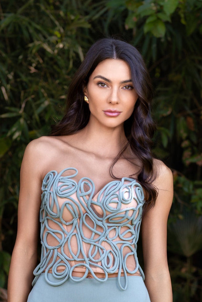 Artesanal e ousado, este top corset é realçado com detalhes em viés aplicados de forma orgânica, criando um design texturizado e único. Estruturado e, ao mesmo tempo, feminino, valoriza a cintura e combina perfeitamente com saias, calças ou shorts — ideal para festas, produções noturnas ou momentos marcantes no verão.