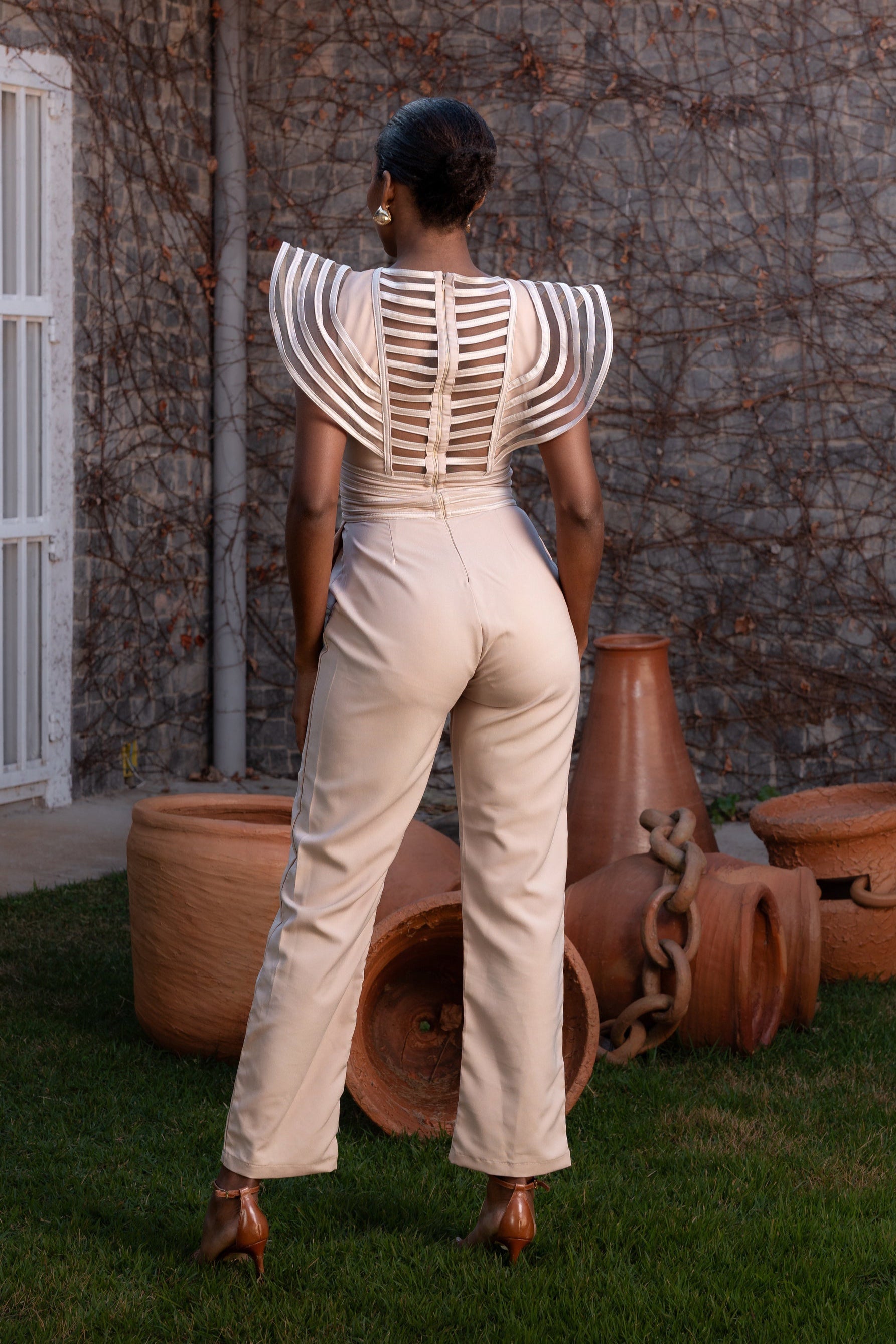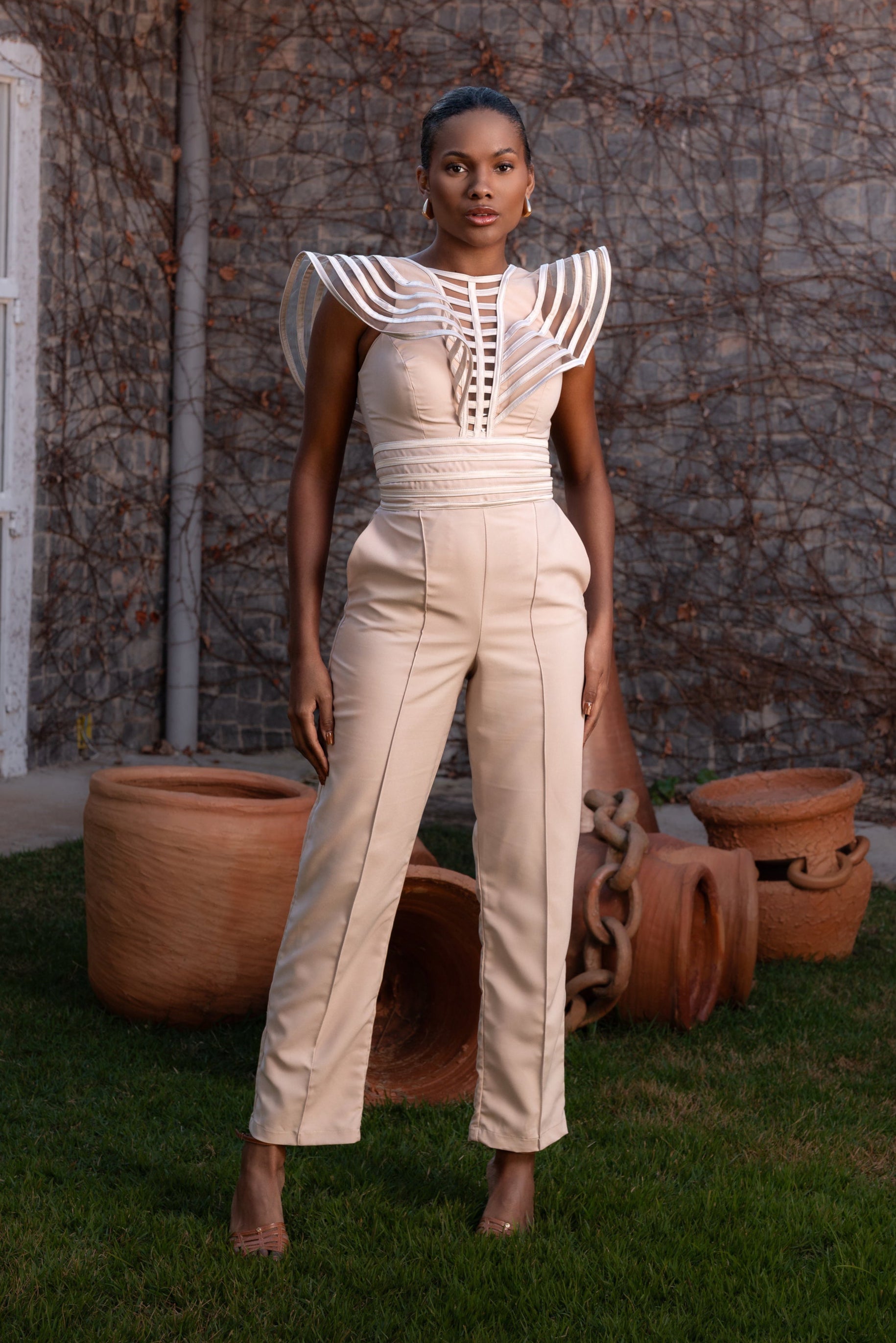 Artesanal e marcante, este macacão possui aplicações de viés na cintura, busto e mangas, criando uma textura refinada e moderna. Com uma silhueta que valoriza o corpo, é uma escolha elegante para festas, eventos noturnos ou produções diurnas cheias de estilo.