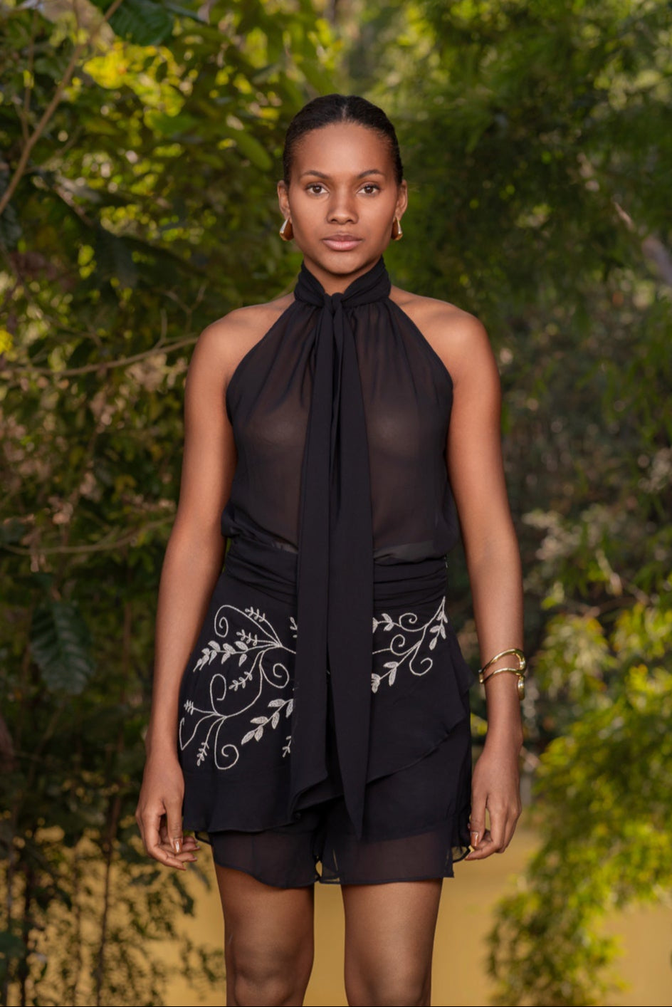 Delicado e feminino, este short-saia de chiffon apresenta bordados em fio minuciosos que adicionam textura sutil e elegância. Com uma silhueta favorecedora e caimento confortável, combina o estilo de uma saia com a praticidade de um short — perfeito para festas de verão, eventos diurnos ou looks de férias.