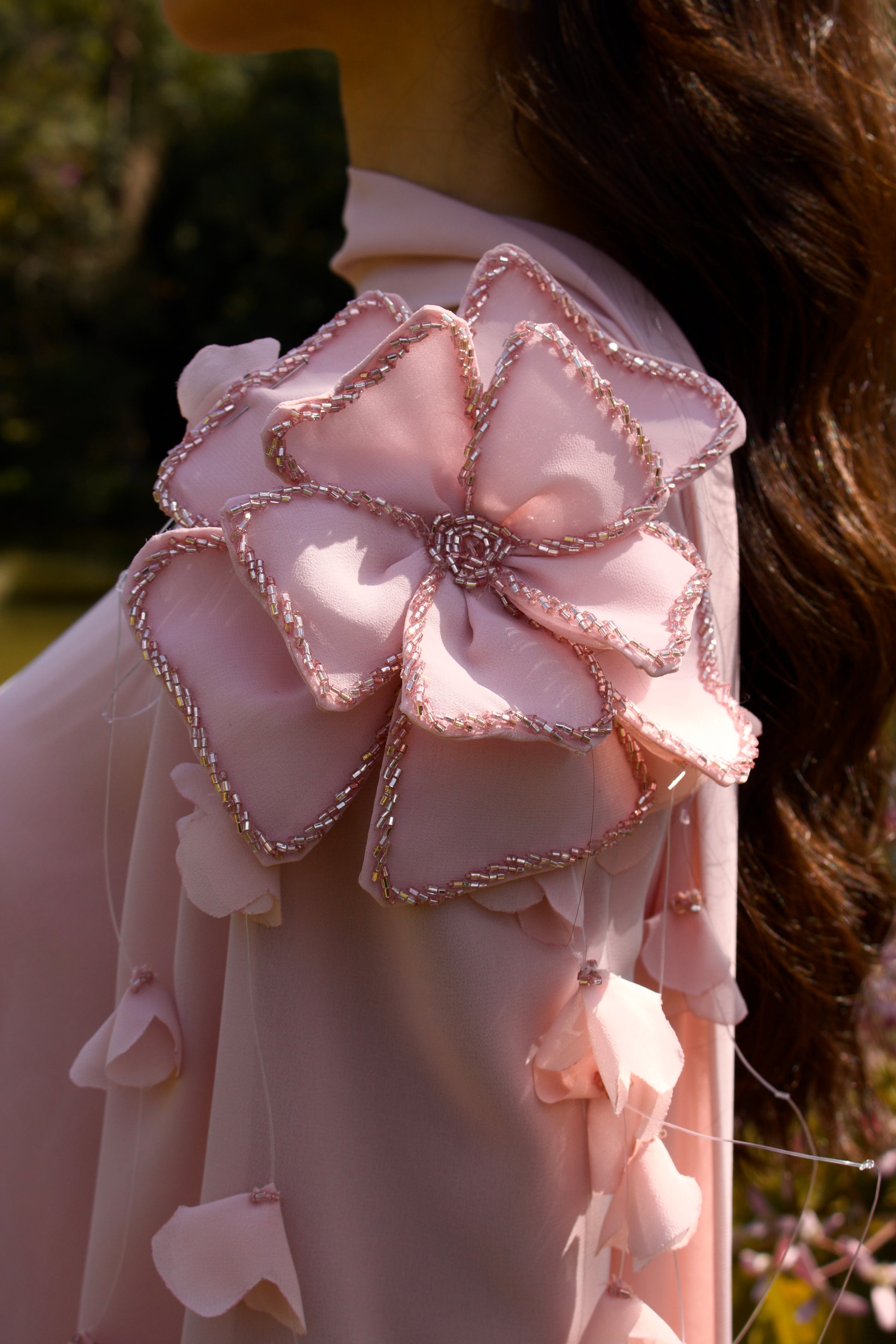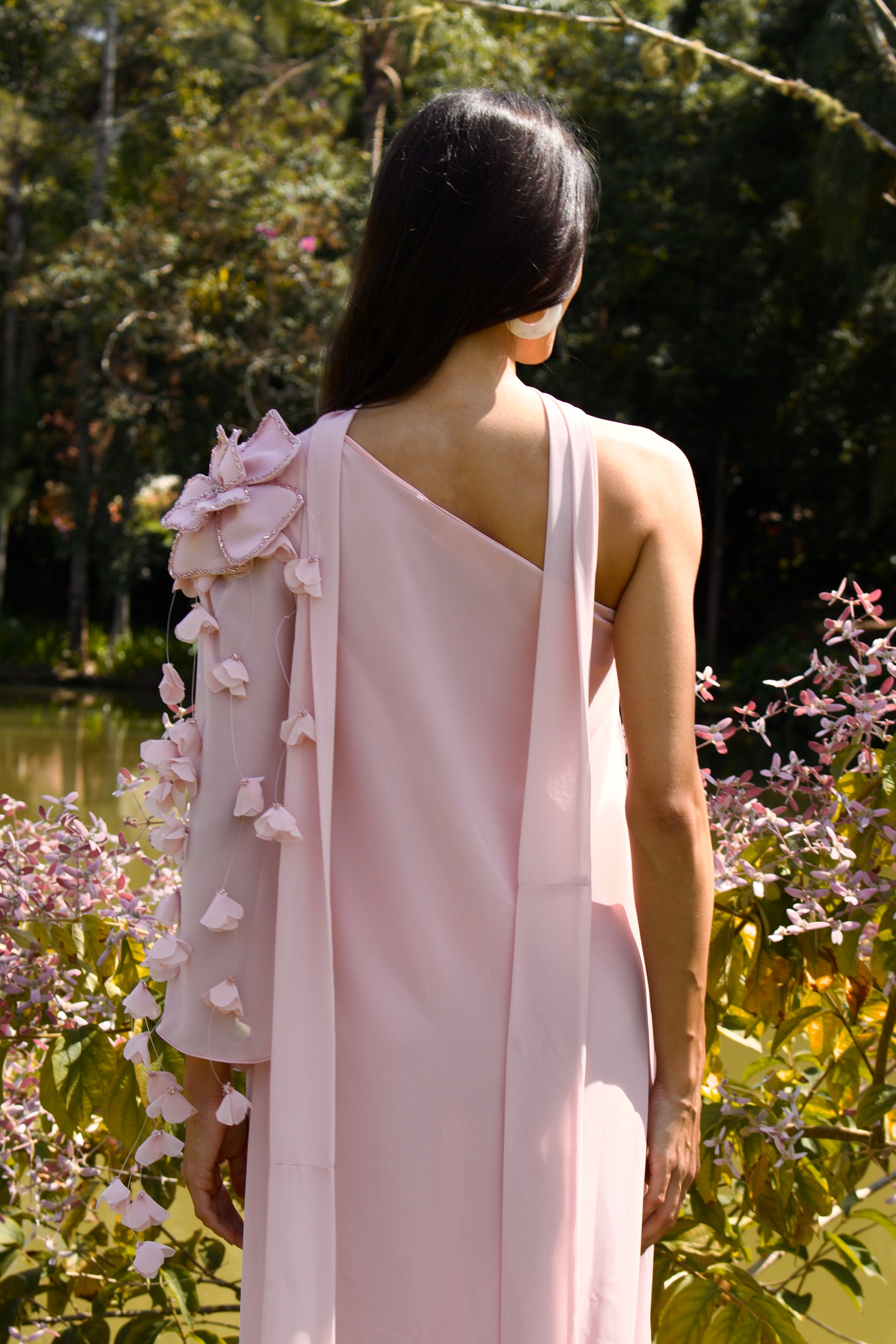 Vestido Midi Um Ombro Só em Crepe GGT com Toque de Seda, Manga Longa e Flor Bordada à Mão.