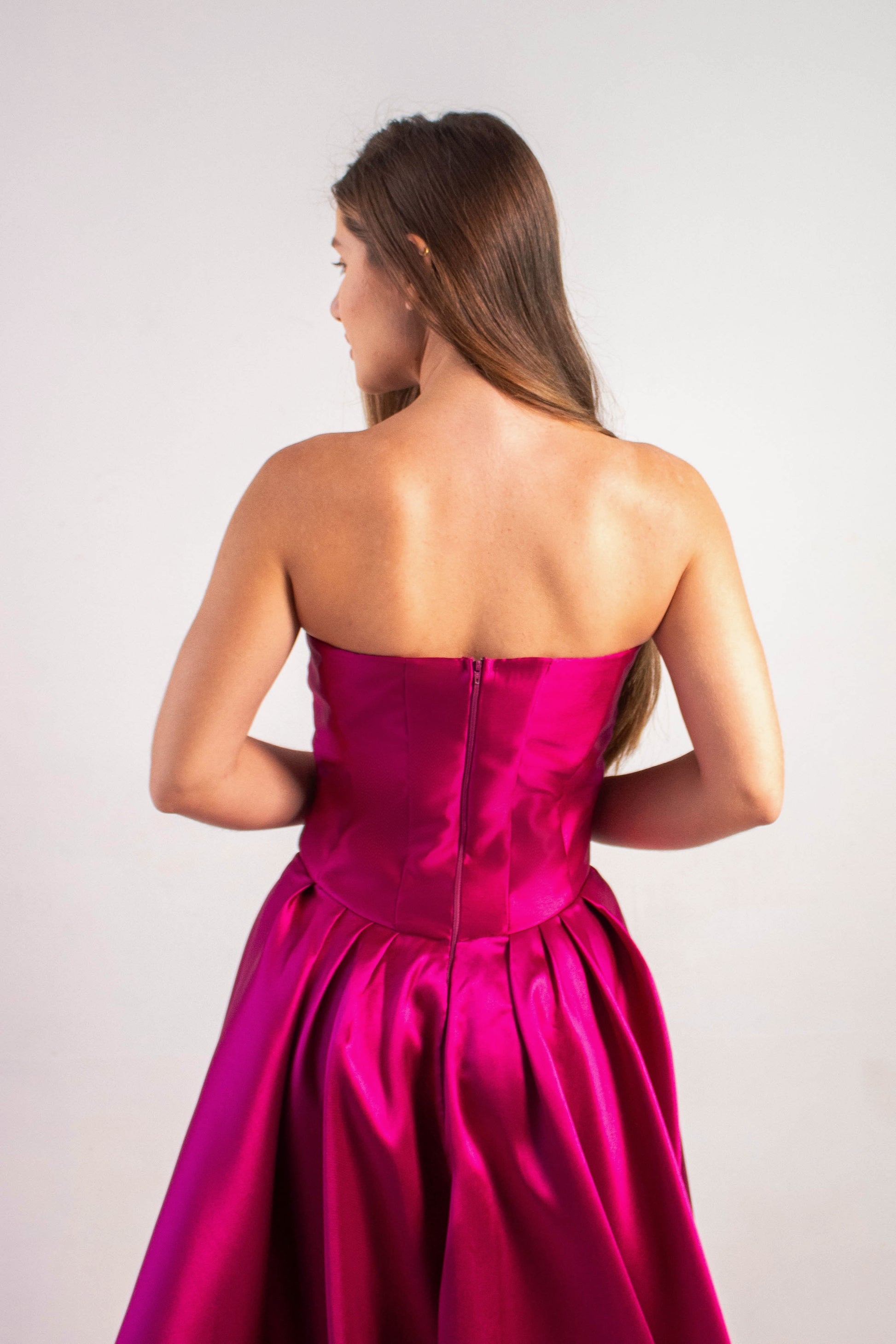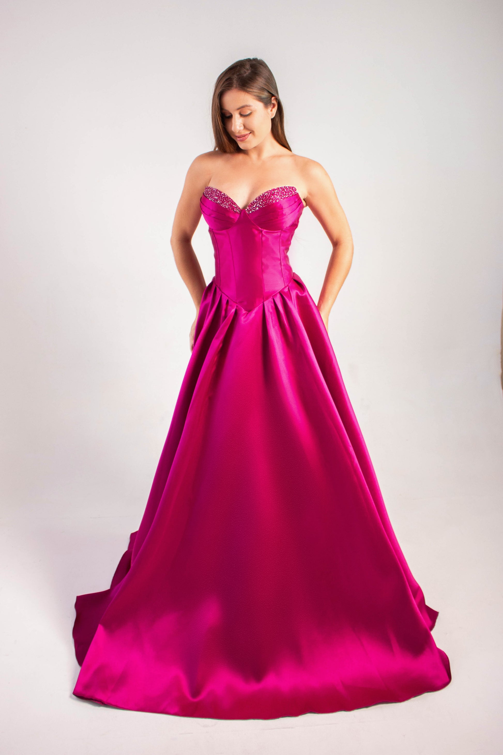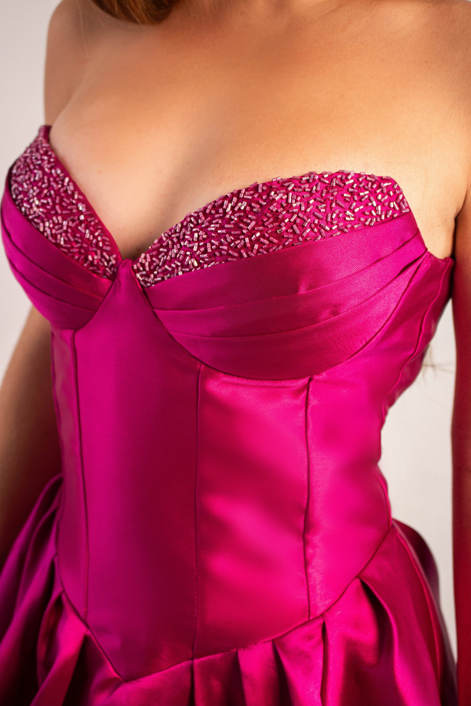 Este vestido é delicado; recomendamos selecionar o tamanho correto para um ajuste impecável e conforto durante todo o seu evento.