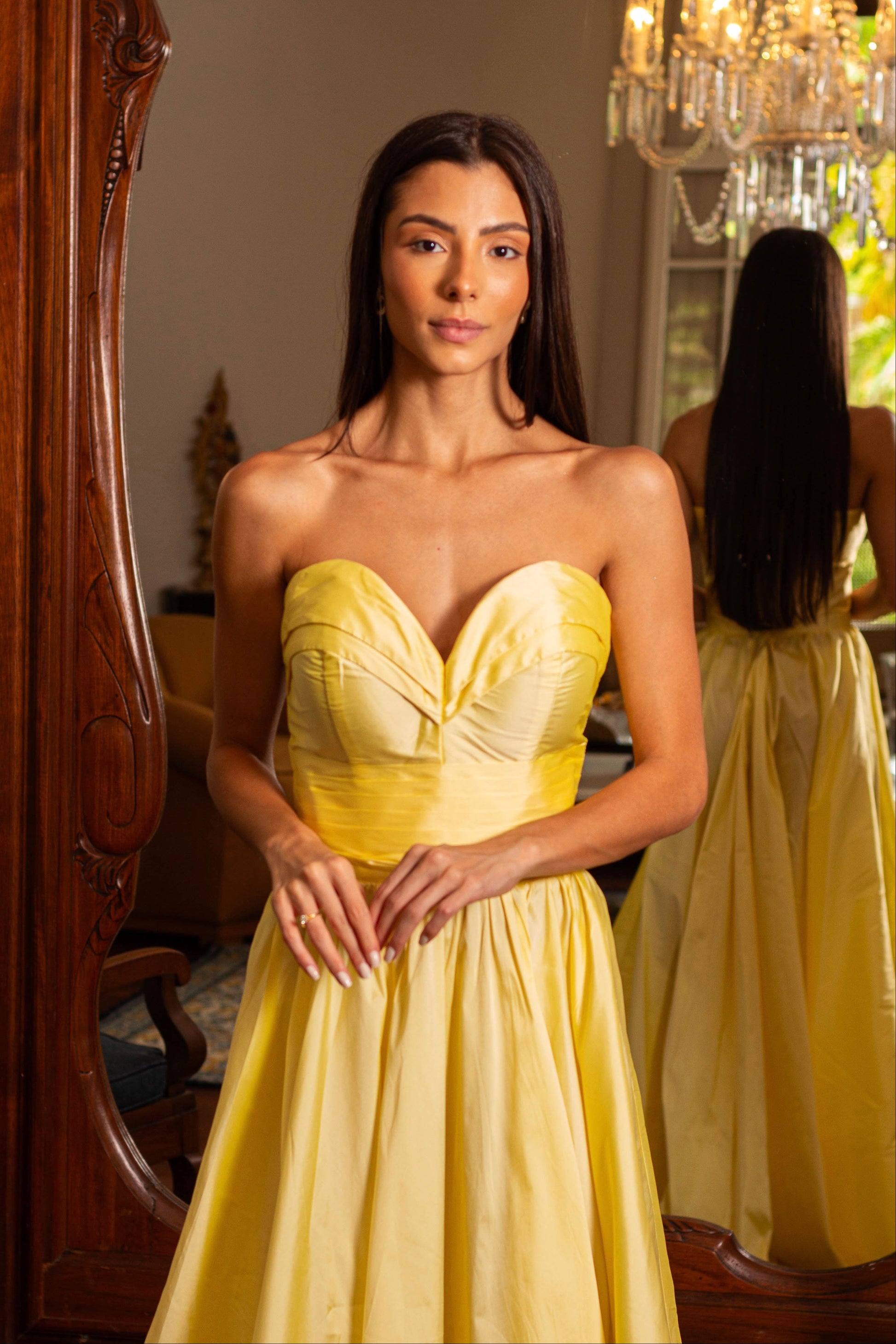 Este vestido é delicado; recomendamos selecionar o tamanho correto para um caimento impecável e conforto durante todo o evento.