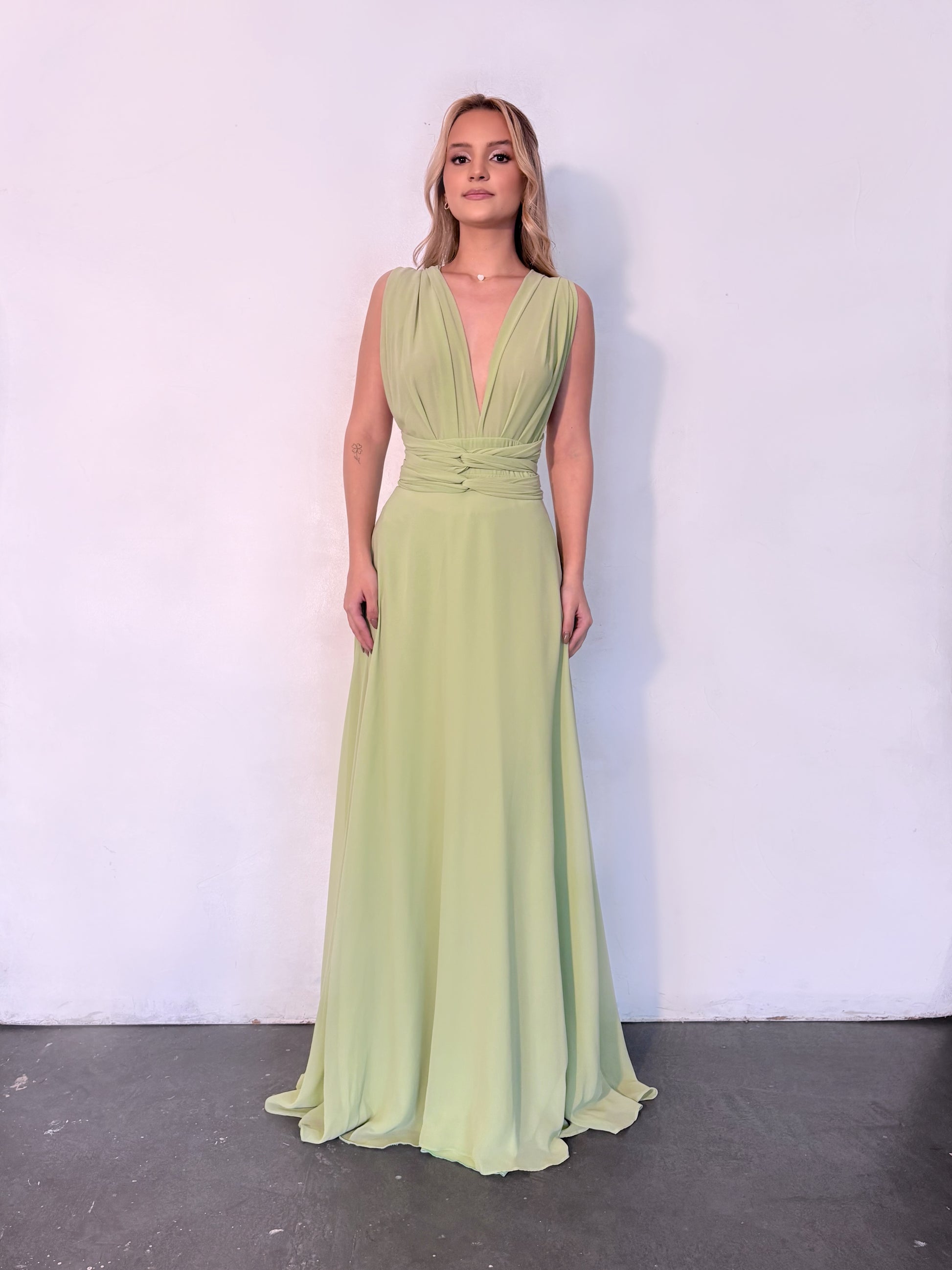 Este vestido é delicado; recomendamos selecionar o tamanho correto para um ajuste impecável e conforto durante todo o seu evento.