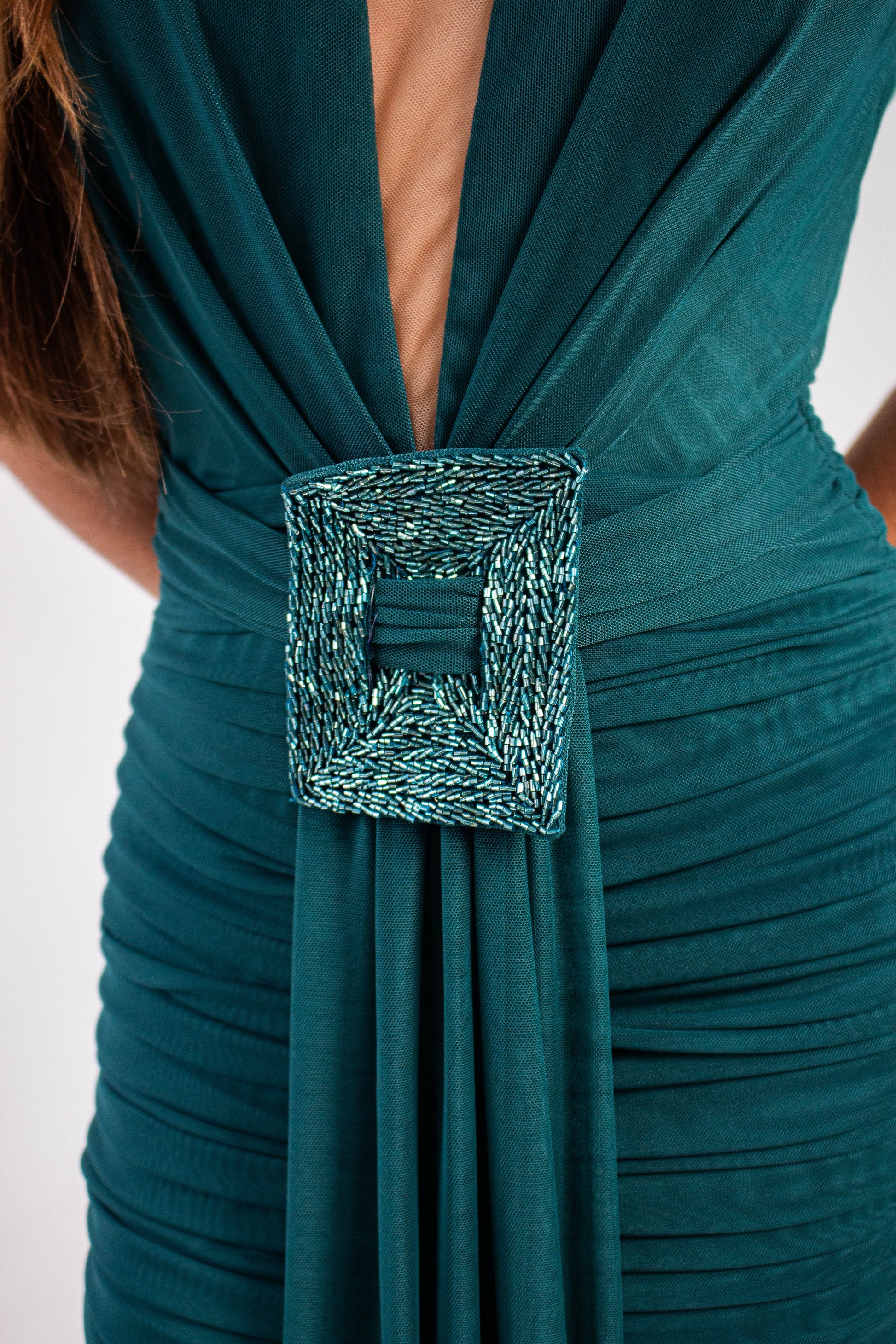 Vestido Em Microtule Sereia Com Decote Profundo E Detalhes Na Cintura Bordado À Mão.