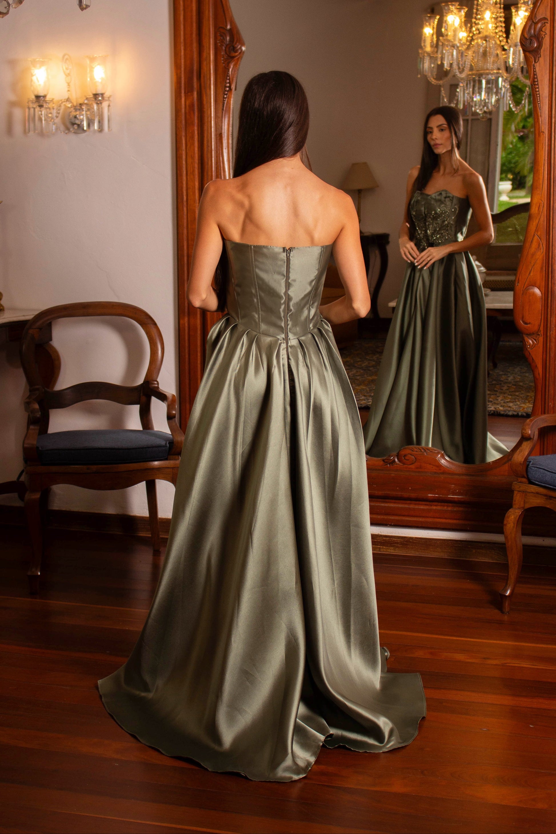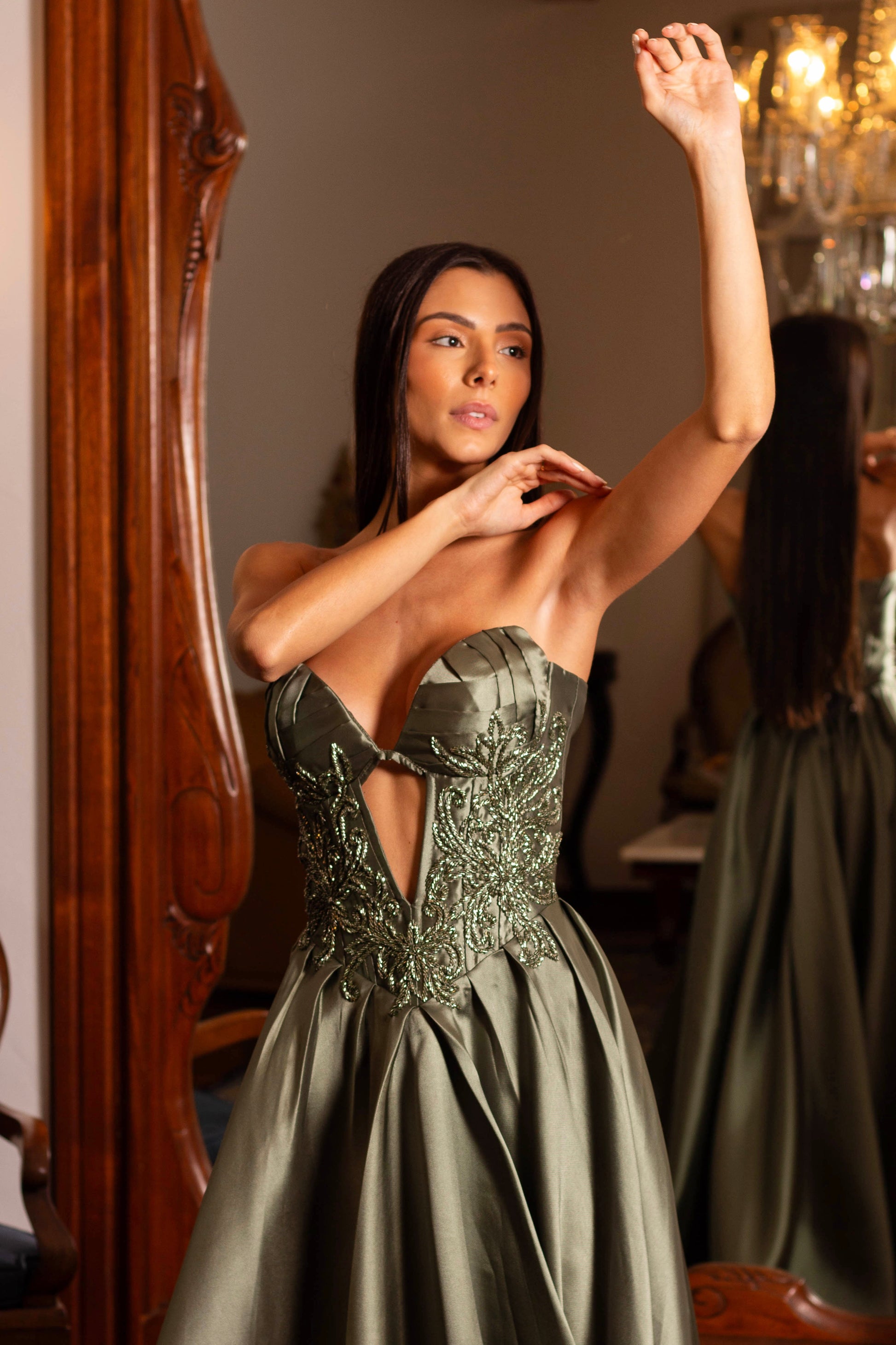 Este vestido é delicado; recomendamos selecionar o tamanho correto para um caimento impecável e conforto durante todo o evento.